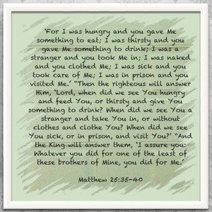 Several months ago now, I had been reading in Matthew 25 and my thoughts returned to the days when we lived in Texas, and because we lived right off a major interstate between Dallas and Ft. Worth, we would often have transients coming to our door. We didn’t have much to give in those days, but we knew that if we ever wanted to offer them the Gospel we would need to meet their physical need first. Sometimes it would be food, other times it would be gas, or help finding a place to stay. Our limited resources and wisdom told us to never give cash–to prevent any misuse.
