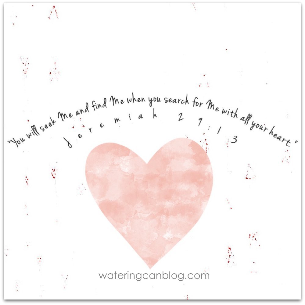 Here’s why:  I know that many of you have never memorized this very important verse–or grasped it’s meaning.  I know that it’s a verse that I need to be reminded of often.  So many of the difficulties we face in life would be avoided if we would just remember to do this FIRST.  Before we rush ahead.  Before we make a mistake.  Before we go our own way.  SEEKING HIM is BASIC to the Christian life–and crucial to our existence.  He created us with a desire for something more than this world offers–and I’m not just talking about heaven–or eternity. He gives us the resources to know the GOD OF THE UNIVERSE, and to live our lives with purpose and meaning.  If you’ve not ever really considered trusting Him, won’t you at least seek Him today?  He’s given us His Holy Word: The Bible.  A great place to start would be the book of John.  Read His story.  See if your eyes aren’t opened to the possibility that He IS real.  That He does care.  AND that His ways are always best and right and good.  I’d love to have a conversation with you if you’d like to know more about a relationship with Him.  Read my FAITH page, HERE, to know how that can happen.  If you would like to personally email me @ wateringcanblog@yahoo.com, I would love to help answer any questions you have as you SEEK HIM.