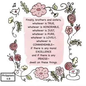 Living out your faith can be a struggle if you try to do it in your own strength. The good news is that even when we are trying to focus on the things that we know are good and true and right, (verse 8) we are not alone.