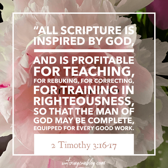 **For anyone who is interested in joining me, I am memorizing a verse from every book of the Bible! You can start with me today with this verse from 2 Timothy 3:16-17, or at the beginning with Genesis, here: Scripture Memory Challenge